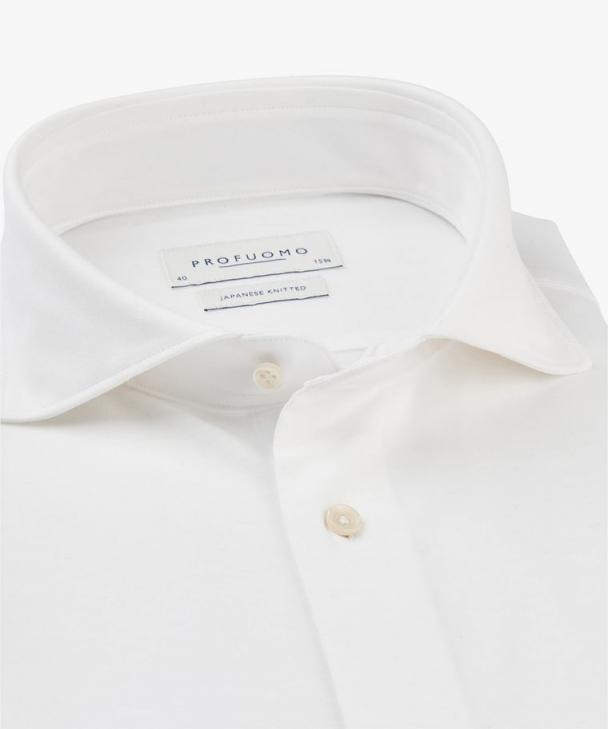 Dit witte Japanese knitted overhemd is gemaakt van een mix van katoen en hightech garen. Het gebreide overhemd combineert de elegantie van een overhemd met het comfort van een t-shirt. Een geweldig overhemd dat zowel formeel als casual gedragen kan worden. Aangezien het een gebreid overhemd is, is strijken niet meer nodig en kun je het iets rustiger aan doen in de ochtend.